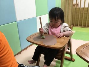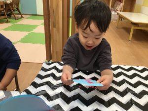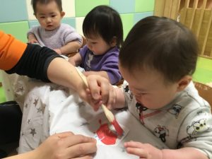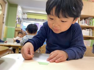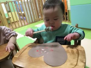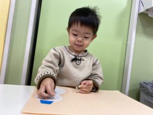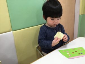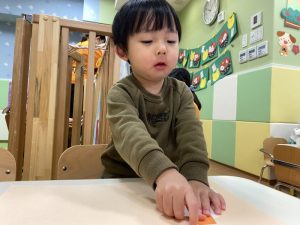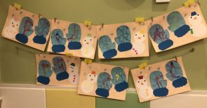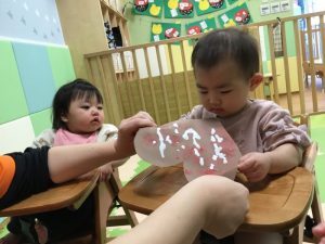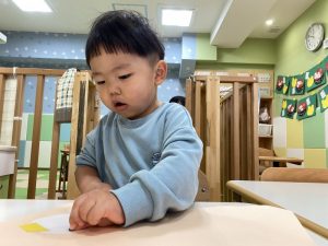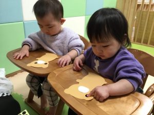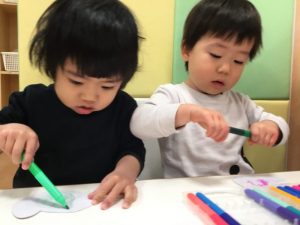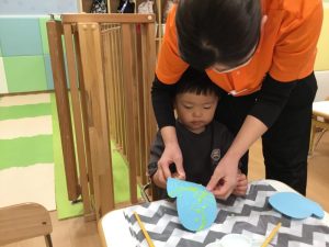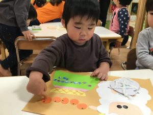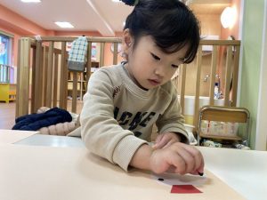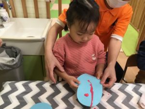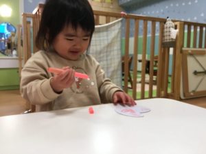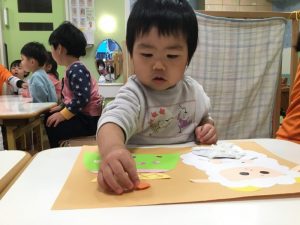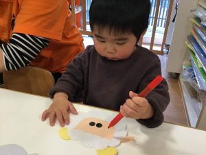 毛糸で、ペンでお絵描きをした手袋にひも通しを保育者と一緒にしましたよ(ひも通しは、一対一で付いていたため、写真がありません?)