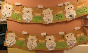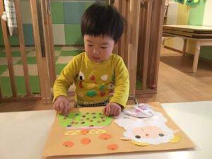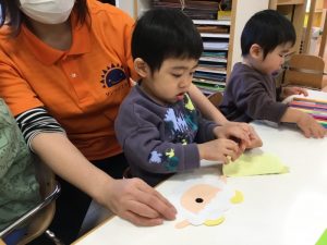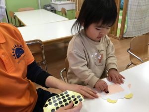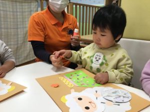 羊さんのお顔に黒の●シールを貼って、目をつけて、赤ペンで口を描いてます?