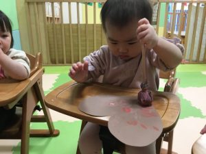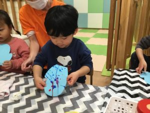 ハートの画用紙にタンポでポンポンと色を付けていきます![]()