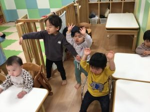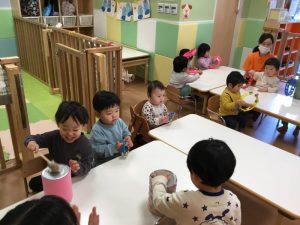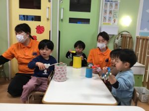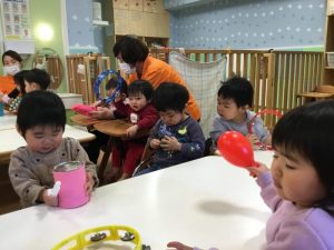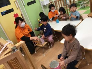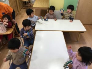 賑やかな音が鳴り響いています。「ゆきやこんこ」「まめまき」「いとまき」どれも楽しいね![]()