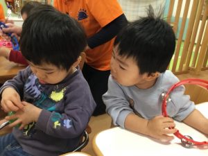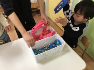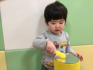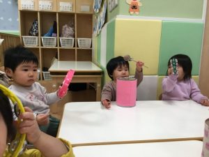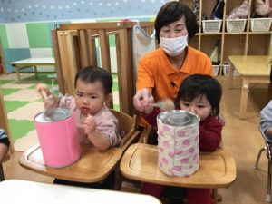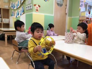 お友だちと、楽器を交代して…。次は「オモチャのチャチャチャ」に合わせて鳴らしてみよう![]()