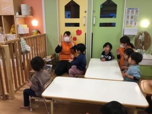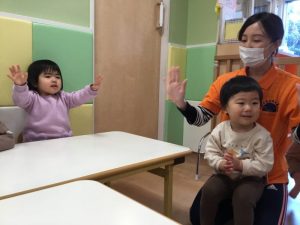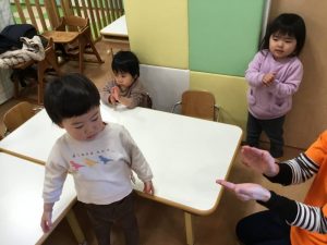 まずは、手を叩いてリズム打ち。先月は2拍子でしたが、今月から4拍子の練習に入りました。少し難しいですが、季節の歌に合わせて両手をパチパチ、膝をトントン、と繰り返していますよ![]()
