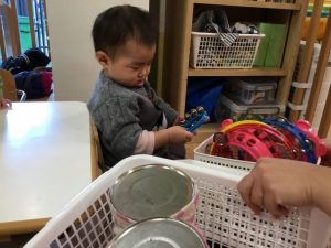 いよいよ楽器に触れます。園では「タンバリン、スズ、マラカス、太鼓」を主に扱っています。今日はどの楽器にしようかな〜![]()