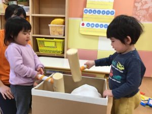 そして、保育者からの出し物のプレゼント「お餅つきごっこ」です?