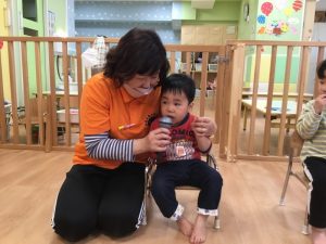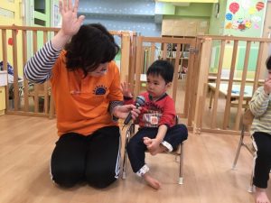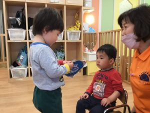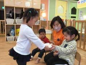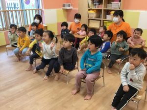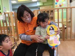 お友だちからみんなに見守られながらお誕生日カードをもらって
