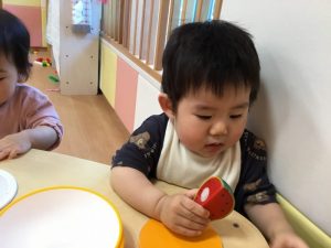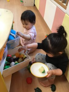 お友だちと線路?を繋げて汽車を走らせたり、おままごとの食べ物?をモグモグと食べる真似をしたりしています。