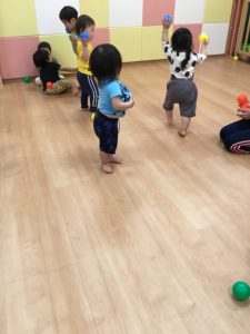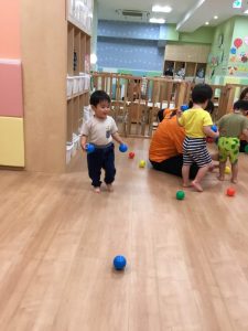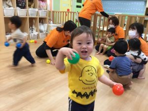 子どもたち同士で真似して、服の中にたくさんボールを詰めて遊んでいます♫