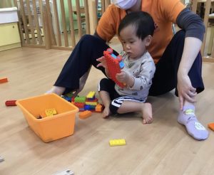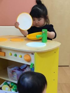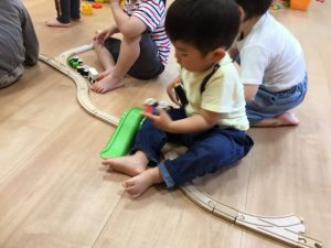 先生のそばで遊んだり、汽車?やブロック?、おままごと?など集中して遊んでいます✨