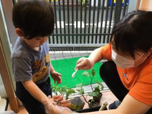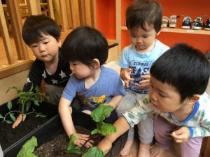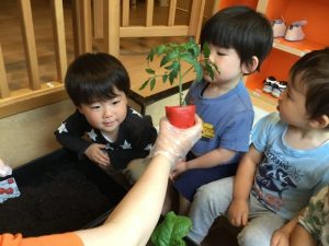 トマト?の苗をクンクンと匂いを嗅いでみたり、なすび?の苗を見てニコニコ?したりと、色々な様子の姿が見られましたよ☺️