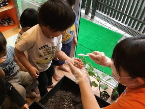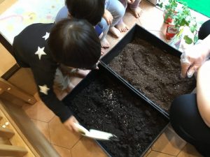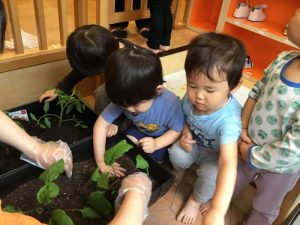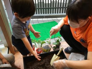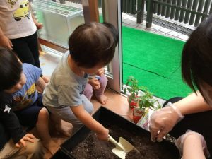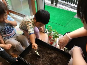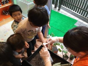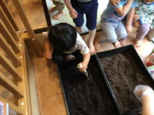 苗?がプランターに入ったら、みんなで一生懸命、ペタペタペタ✋