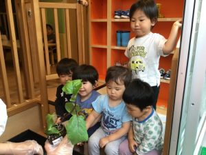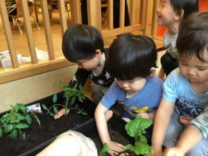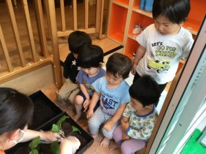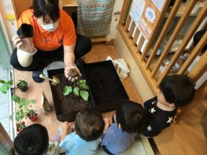 植えている手元をじっくり観察しているりんご組さんたち?