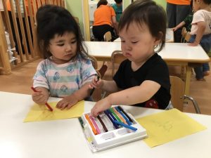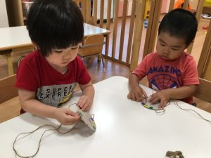 あや先生が色分けをしてくれていて、「同じ色の穴に紐を通すんだよ。」とお話しもしてくれていました?