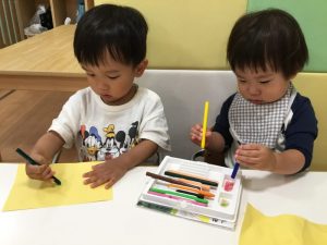 黄色の画用紙にクーピーでお絵描きをしました‼️