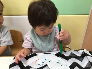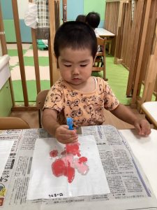 絵の具をスポイトで吸い取り、スポイトでポタポタとペーパータオルの上に落としていきます。