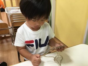 とても一生懸命に紐通しを頑張っていましたよ。