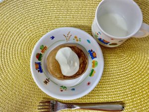 今日のおやつはお誕生日メニューでパンケーキホイップ添えでした。子どもたちはスプーンに残ったホイップまでペロペロと食べていました♪笑顔で給食を食べている様子が見れて嬉しかったです。