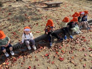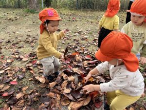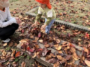 お友だちと協力して、ベンチが見えなくなるまで落ち葉を乗せていましたよ🍂🍂