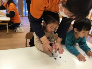 保育者と一緒にペン✏️を持ち、可愛いお口が描けました😆