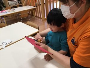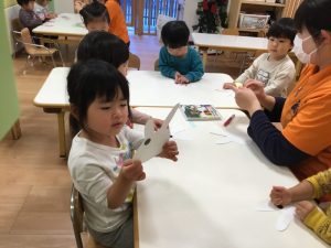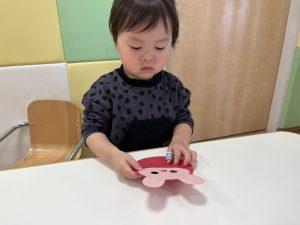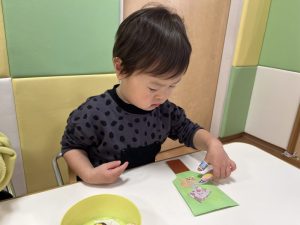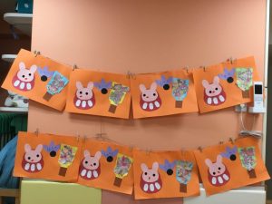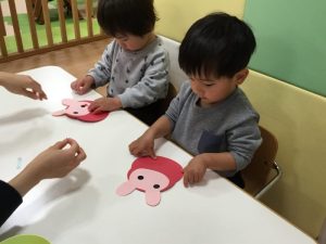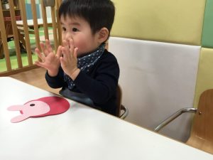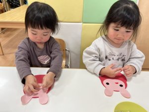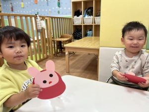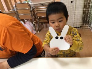 貼れたよ!とうさぎを見せている子や上手に貼れて拍手している子もいてますね☺️