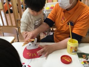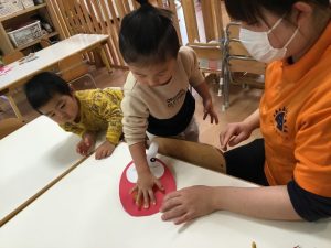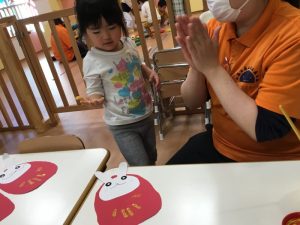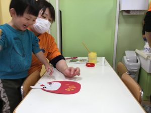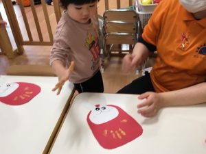最後に、手形✋でだるまの模様をつけます!