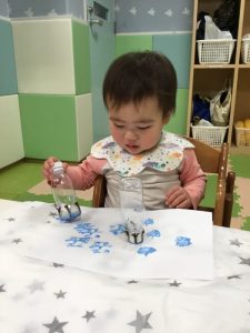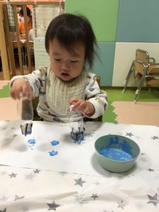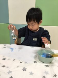 白い紙に夢中でペタペタ色を付けていますよ❄️
