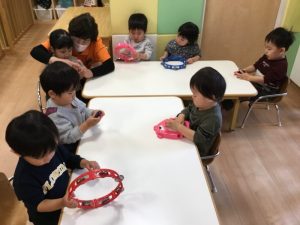 カスタネットの紐を保育者と一緒に通したり、タンバリンを元気よく鳴らしたりしてます😊