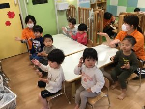 保育者を真似してタン、タン、ウンと上手に手を叩いて楽しんでいますよ😊