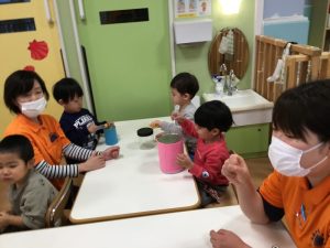 1歳児さんは、鈴をしっかり握って楽器を鳴らしていますね🎶