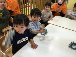 2歳児さんは、カスタネットの紐を上手に指に通して叩いていますね✨