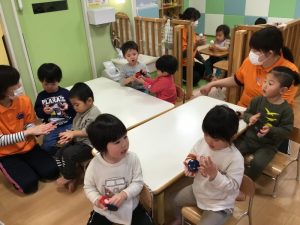 初めは、保育者が各クラスに楽器を配ります!