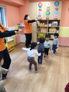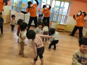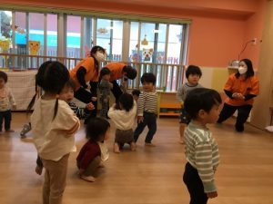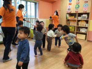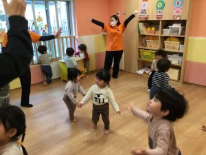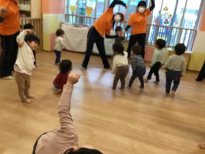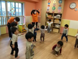 音楽に合わせて身体を揺らす0歳児さんや保育者を真似して身体を動かす1.2歳児さんの様子がよく見られ、とても元気な様子が伝わってきましたね!