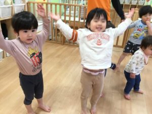 「左マッチョ〜」では、1歳児のお友だちも2歳児のお友だちも上手に真似っこ😊
