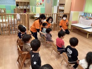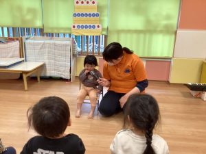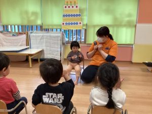 保育者の横に座って、お返事ハーイ👋