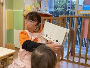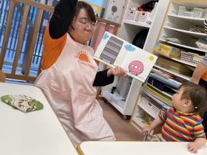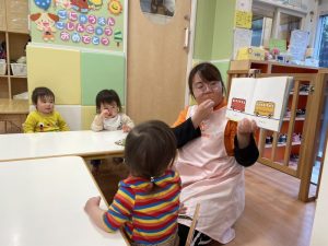かほ先生が朝おやつ終わりに絵本を読んでくれましたよ😄