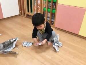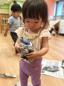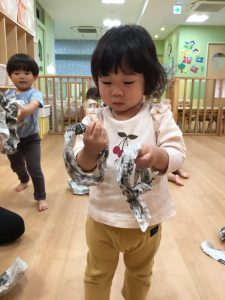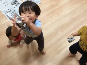 まずは新聞の感触を楽しむこどもたち。さぁーびりびりとやぶるよー![]()