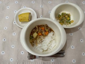 給食前、今日の献立紹介の際に、「カレー!!」と大きな声が聞こえ、デザートのバナナを持っていくと「バナナ!!!」と嬉しそうに声を上げていました。