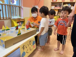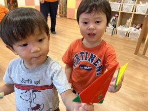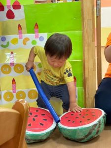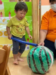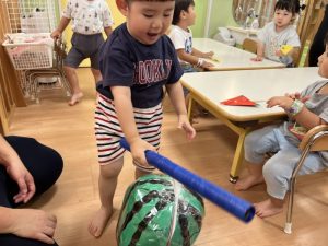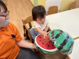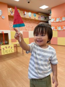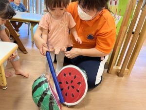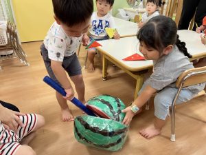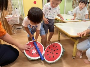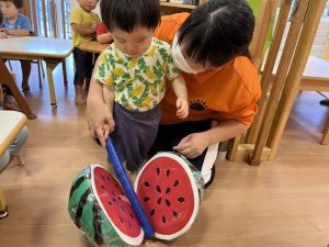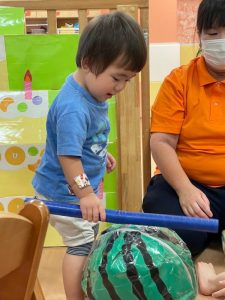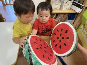 お誕生児のお友だちが一番大きいスイカを当てていましたよ🍉