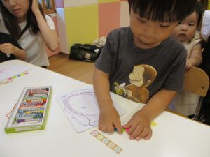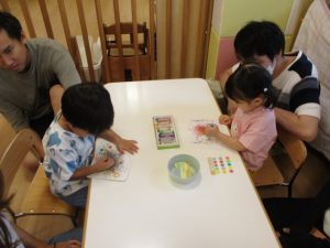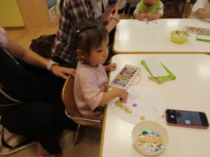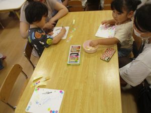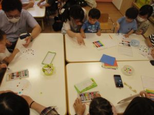 いちごぐみさんはうちわに飾り付けをしますよー。真剣に絵を描いてシール貼りもしましたよ![]()