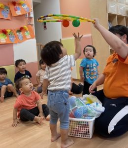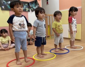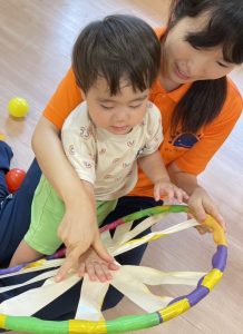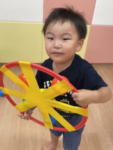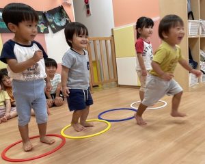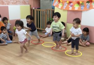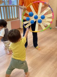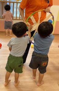 最後の方はフラフープを車のハンドルに見立ててバスごっこをしたり、みんなで協力し