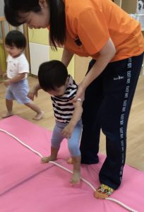 保育者に支えられながらも頑張ってカニさん歩きで渡る事に挑戦✨