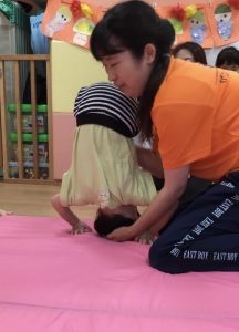 マット運動では、ロープ平均台渡りや前転をしています![]()