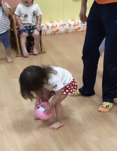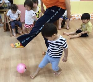 保育者の真似をして片足を前に出してキック🦵🏐💨