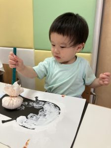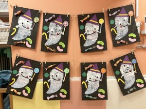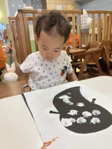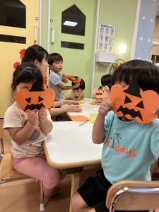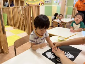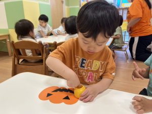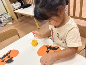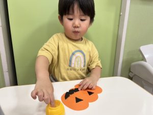 スタンプした後、型紙を開くとおばけの形になっていて、「おばけー」と言う子どもたちでした👻