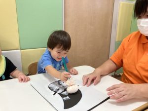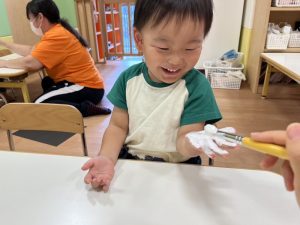初めはおそるおそる慣れてくると真剣にポンポン押し、色がついてくると不思議そうに見ていた子どもたちでしたよ♪