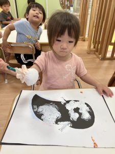 黒い画用紙の上におばけの形の型紙を載せて、タンポでスタンピングしましたよ![]()