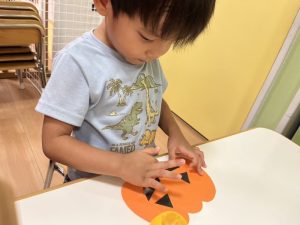 まずはかぼちゃ🎃の形の画用紙に目や口のパーツを糊付けしましたよ👀