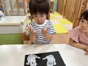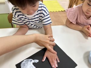 そしてお次は、黒い画用紙に手形をペタペタ。