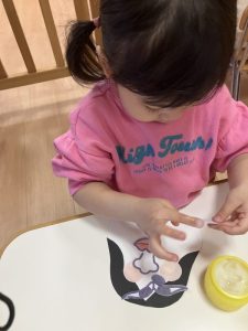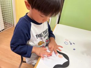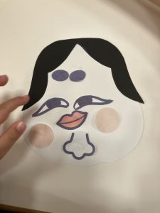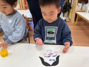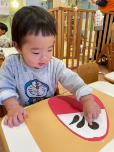 目や鼻ほっぺや口の位置を決めて、のりでつけていきましたよ![]()