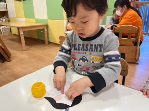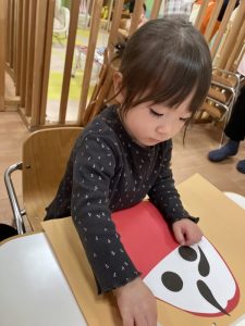 だるまさんの形の画用紙に目と眉毛をつけていきますよー![]()