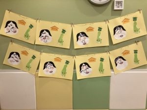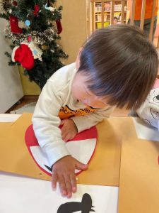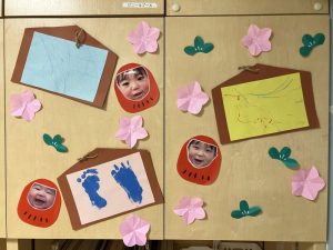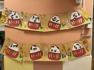 なぐりがきや足型は絵馬に変身しました。みんなのお顔のだるまも可愛いいですね![]()